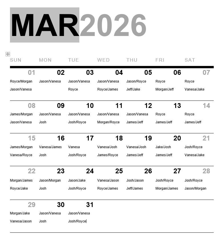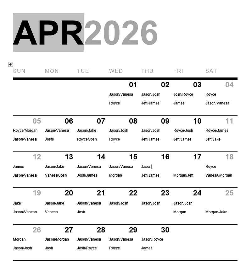 The following reps are typically available for the designated shifts. Feel free to reach out to anyone on the E-board if you have any questions or need assistance with anything though.